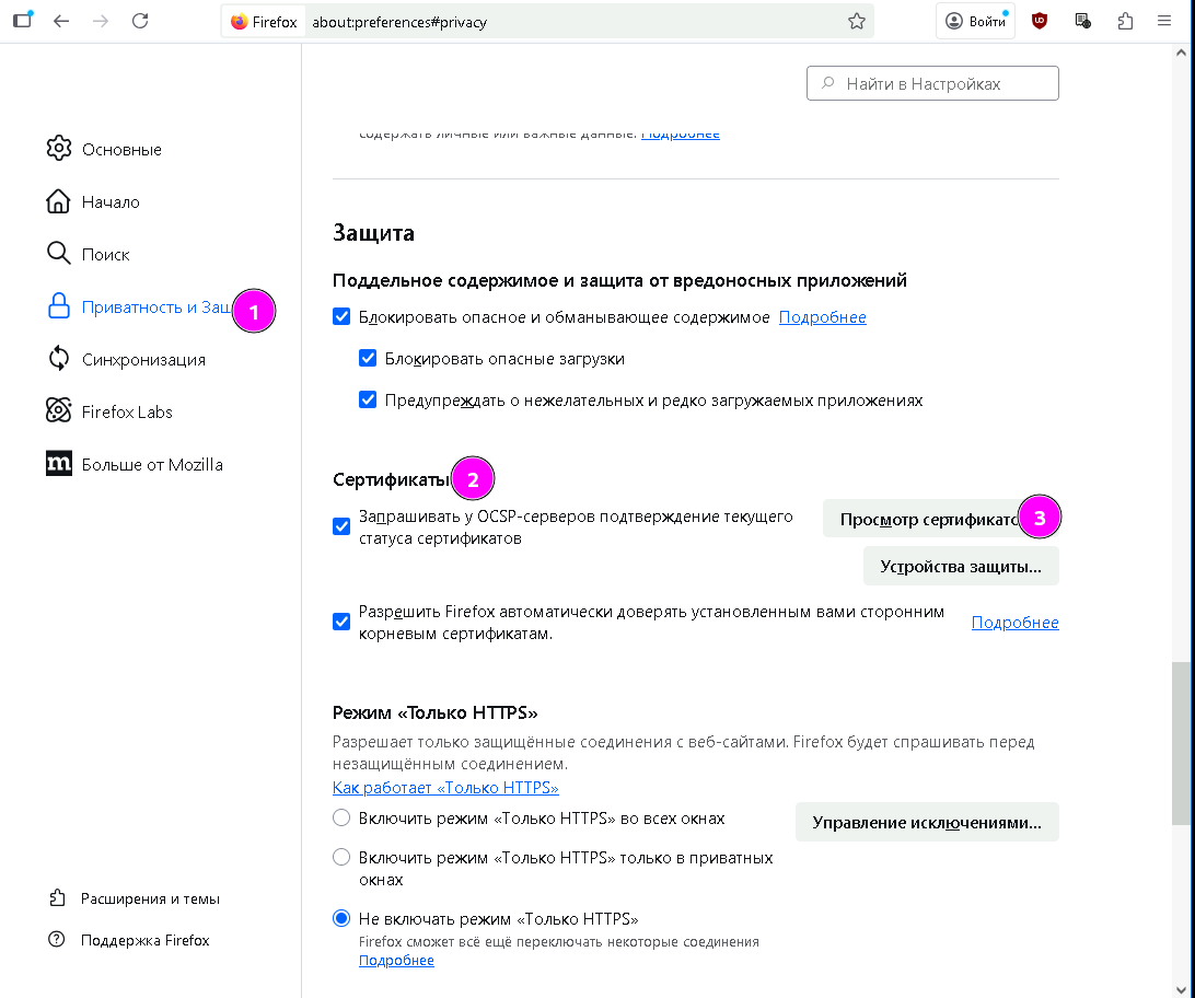 3.2 Перейдите в «Приватность и защита» и найдите раздел «Сертификаты». Щёлкните по кнопке «Просмотр сертификатов»