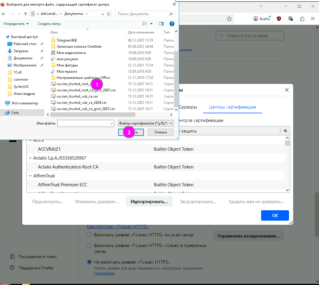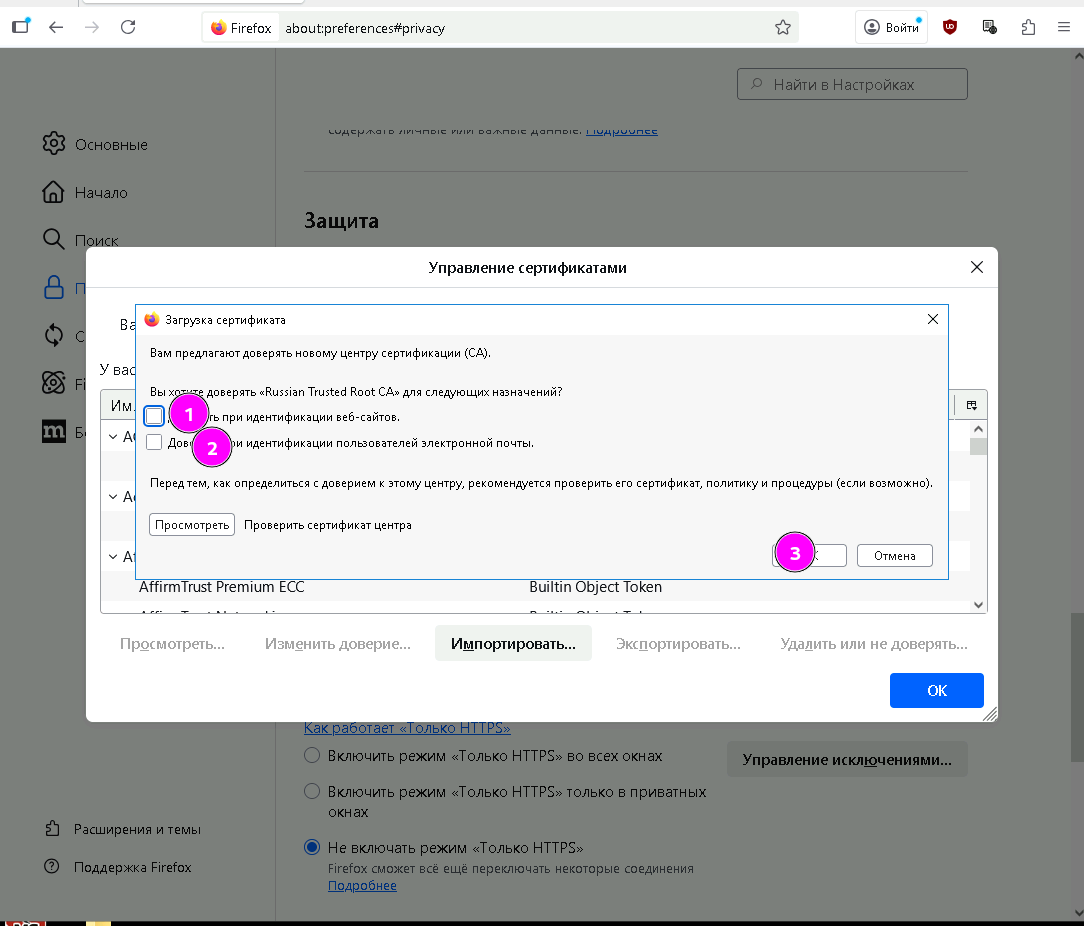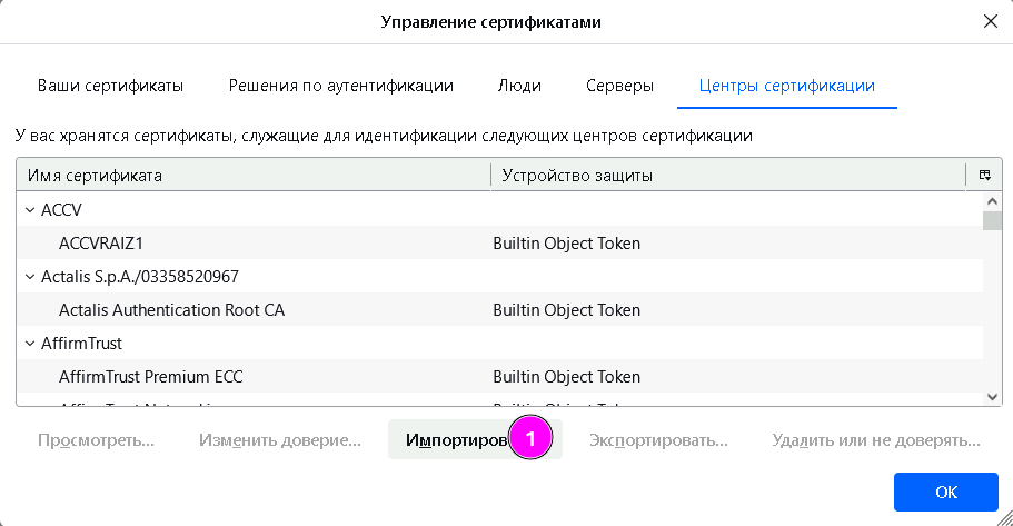 3.3 В открывшемся окне, перейдите на вкладку «Центры сертификации» (Firefox не разделяет корневые и промежуточные) и импортируйте сертификаты по очереди. Первыми импортируйте файлы в которых есть «root_ca» в имени.